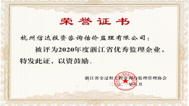 喜訊!杭州信達(dá)投資咨詢估價監(jiān)理有限公司榮獲2020年度浙江省優(yōu)秀監(jiān)理企業(yè)的榮譽稱號?